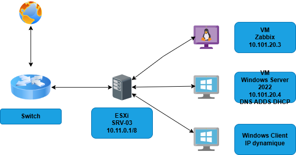 Équipements réseau : Un switch relie le serveur ESXi à l'ensemble des VM simulant un environnement d'entreprise.